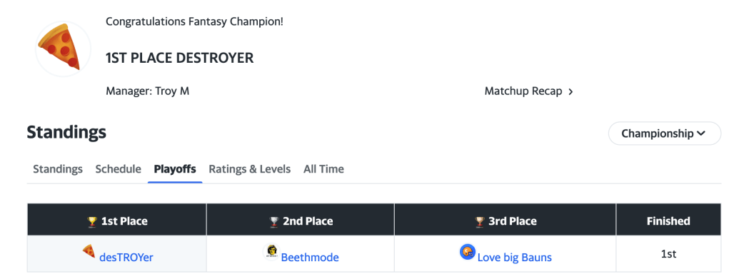 I have been in the top-5 in fantasy football since 2016 [aka bridesmaid], with the exception of my first Fantasy Football Super Bowl in 2022, my first (and only) last place finish the following year (2023), and now this, my second Fantasy Football Dungeons & Dragons Lombardi Trophy! So what do I get? Eh, it’s a couple hundred bucks or something like that, but the real prize is pride and bragging rights… me, #1, best-of-the-best (or rather, luckiest-of-the-luckiest). Regardless of how I got there, I’ll take it, and I’ll do my best to defend the title next season 💪🏼💪🏼